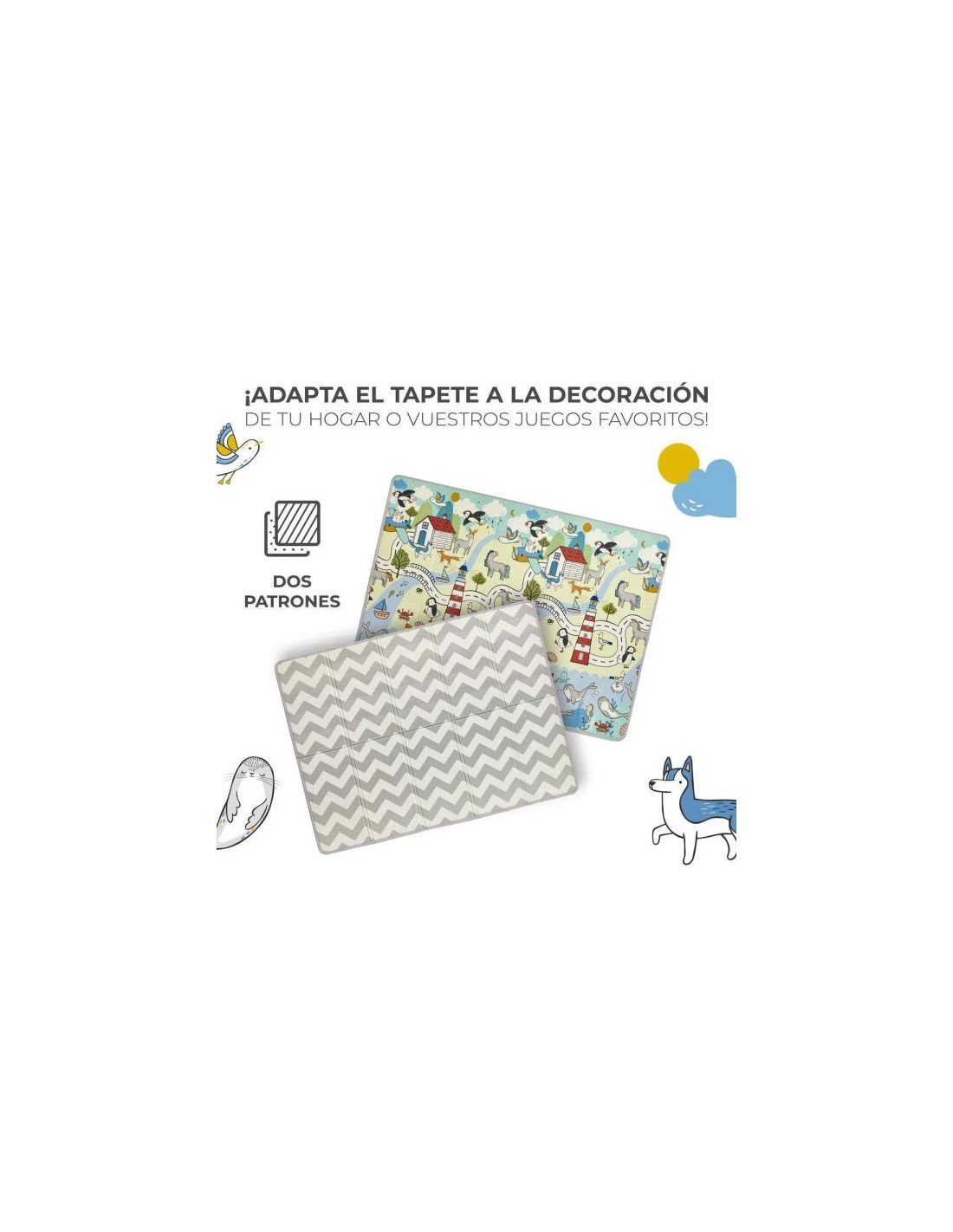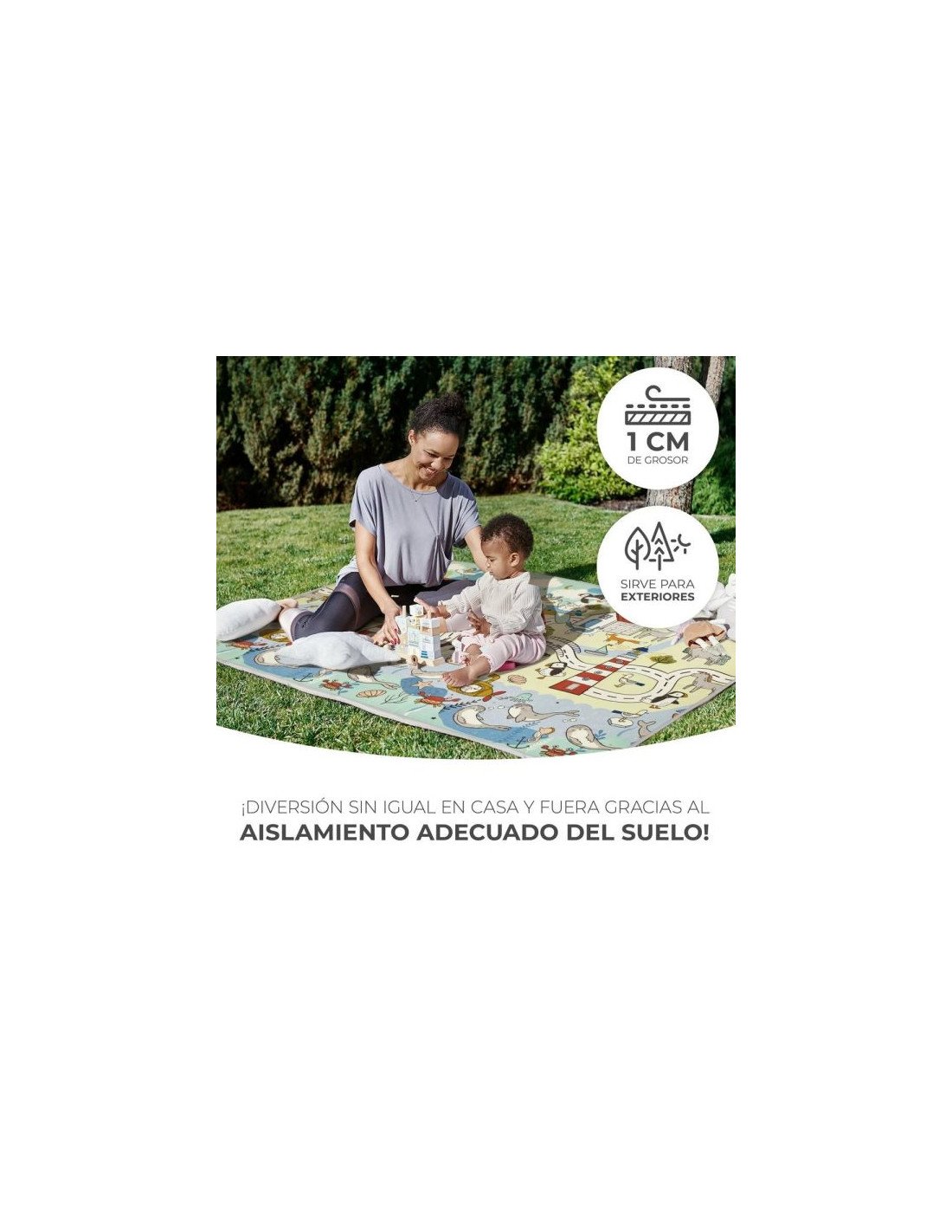 Juegos seguros: Fabricado con materiales seguros para los niños, uno de los lados cuenta con una capa antideslizante que evita desplazamientos durante el gateo o al levantarse.