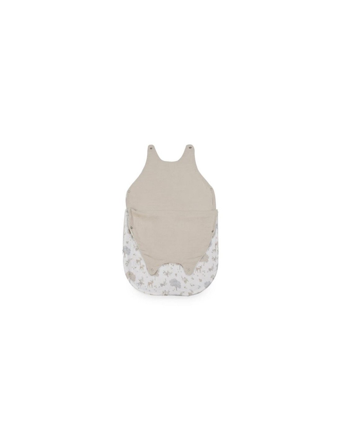 El saco de dormir de verano para bebés Nara está confeccionado en muselina estampada de ciervos y árboles en tonos neutros de algodón 100%, resultando extra suave y contando con la transpirabilidad perfecta para la delicada piel del recién nacido.